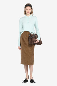 This velvet pencil skirt is crafted from soft velvet, ideal for an elegant and comfortable look. It features a fitted fit that hugs the body, reaching to the knee. The back features a zip closure, while stitching details add a touch of style. Available in a brown shade, this skirt is perfect for versatile pairings. DETAILS Color: Hazelnut Composition: 100%CO Product Code: 25IN2S0C01202111130 Made in Italy SIZE AND VESTIBILITY The model wears size 40. The garment fits regular.