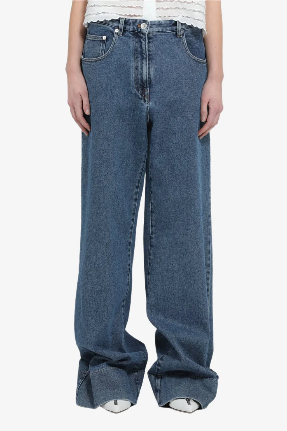 Wide-leg blue denim jeans with high waist and five pockets. Long hem with cuff. Zip and button closure. DETAILS Color: Indigo Composition: 98%CO 2%EA Product Code: 25IN2C0220100516001 SIZE AND VESTIBILITY The model wears size 26. The item fits oversized.