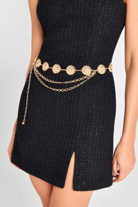 The ALEX Black Dress is crafted from black boucle-tweed with a shimmer thread running through and features a sculpted fitted silhouette with slit detailing for added edge. The square neckline at the front and V-back create a flattering contrast, while seam detailing throughout enhances the figure. Embossed circular chain straps add a bold touch, with elasticated backs for comfort and ease. Style it with or without the detachable layered coin adorned chain belt for a refined flair. - Black boucle-tweed fabrication with a shimmer thread running through - Square neckline at front, V-neckline at back Fitted mini silhouette, with slight slit at front - Seam detailing at front and back for a sculpted finish - Embossed circular chain straps, with elasticated back for comfort and fit - Concealed zip closure at back - Fully lined in satin - Detachable layered chain belt - Outer: 100% Polyester, Lining: 97% Polyester 3% Elastane Size & Fit Information - Item runs to our size chart. Please refer here for the best fit -Designed to be fitted to the bust and waist with a flowing skirt - Model is 176cm/5'8" wearing 4" heels and a size S - Stretch Factor: No Stretch