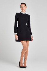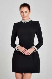 ATHENA is a high-neck mini with long sleeves, crafted from our signature black crepe fabric. Featuring pearl droplet detailing to the neckline and sleeve cuffs and our signature tulip style skirt with functional pockets to the side. Finished with a concealed zip down the centre back, concealed zips to the sleeve cuffs, and fully lined for a smooth fit. - Signature black crepe fabric - Mini dress - High neck - Pearl droplet embellished detailing to the neckline and sleeve cuffs - Long-sleeved - Signature tulip-style skirt with functional pockets to the side - Concealed zip down the centre back - Fully lined for a smooth fit - Outer: 89% Polyester 11% Elastane Size & Fit Information - Item runs to our size chart. Please refer here for the best fit. - Model is 179cm/ 5ft 9 wearing 4.5” heels and size XS - Length from centre front top edge to hem is 82.5cm based on a size XS - Stretch Factor: No Stretch
