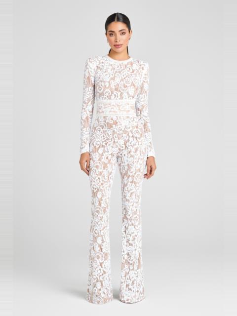 Make every entrance unforgettable in the BELLA White Floral Lace Jumpsuit, a signature MERABI design crafted for modern elegance. Featuring sequin-embellished white floral lace over a soft light nude lining, and the MERABI signature flared leg and padded shoulders, this jumpsuit creates a sculpted finish. Complete with a detachable faux leather corset belt to cinch your silhouette. Design Details Sequin-Embellished Lace - Delicate white floral lace is adorned with shimmering sequins, catching the light with every step. Detachable Corset Belt - Define your shape with the included faux leather corset belt, or remove it for a more relaxed feel. Light Nude Lining - Designed for subtle coverage, the light nude lining enhances the dimension and detail of the intricate lace overlay. How to Wear Style with ivory or metallic heels for a clean, elevated look. Add pearl accessories or a crystal-embellished clutch for a refined evening edit. Layer with a tailored blazer or wear solo to let the lace take centre stage. Size & Fit Information - Item runs to our size chart. Please refer here for the best fit. - We recommend if you are 5'8" or above to select the size up. - Body length from top edge centre front to waist seam is 34.7cm based on size XS, inside leg is 90cm on all sizes inside leg 90cm - Stretch Factor: Super Stretch - Model 1 is 174cm/ 5'7" wearing 4” heels and a size XS - Model 2 is 176cm/5'8" wearing 4" heels and a size XS - Please note that if your style arrives longer than you desired it can be easily taken up by a local tailor.