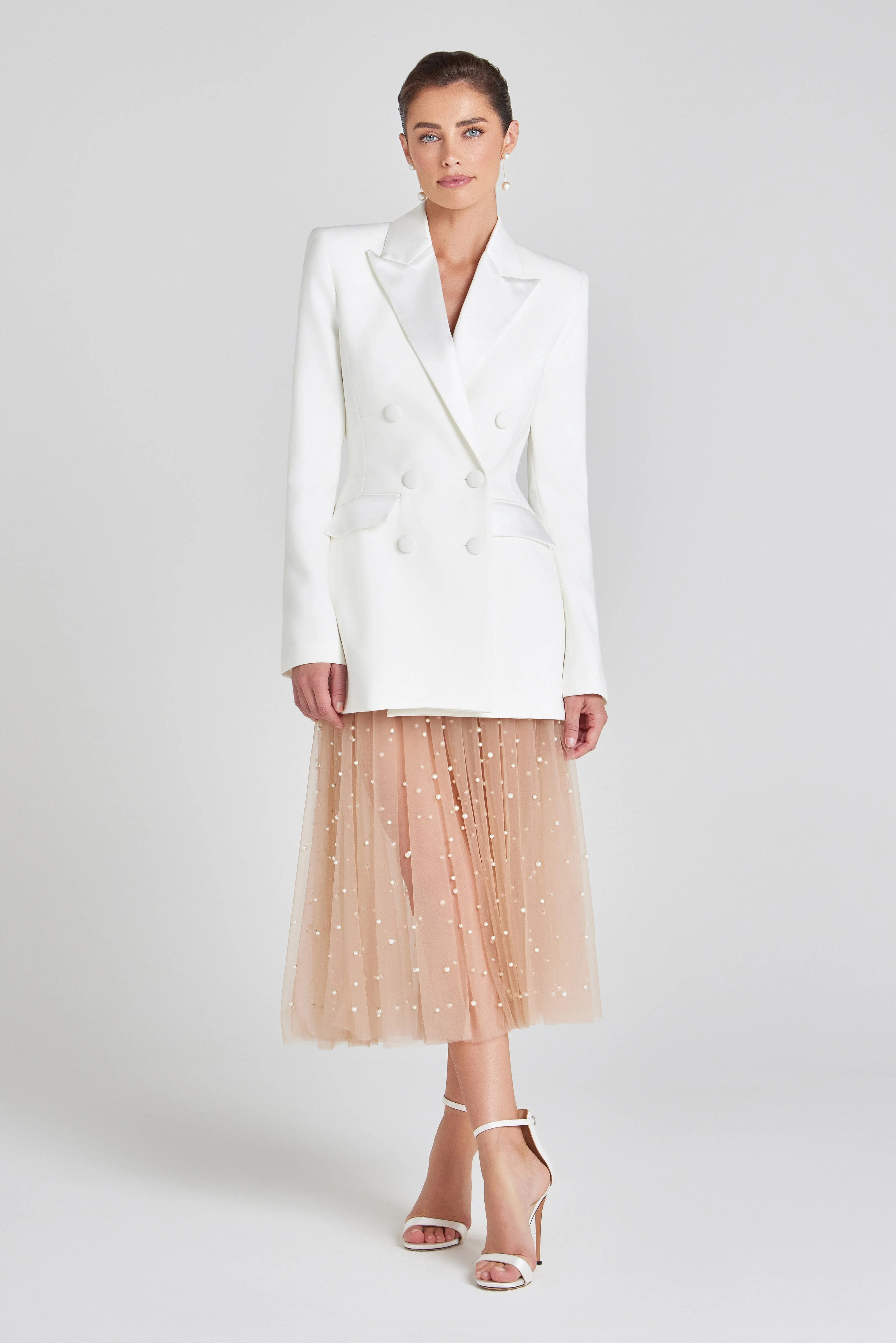 Channel true elegance with our BLAKE Nude Skirt. This midi skirt showcases a double-layer design crafted from sheer nude mesh and is beautifully embroidered with delicate white pearls. Pair with our MONICA White Blazer dress to complete the look. - Midi skirt - Double-layer design - Sheer nude mesh - Embroidered with delicate white pearls - Outer: 100% Polyester Size & Fit Information - Item runs to our size chart. Please refer here for the best fit. - Model is 175cm/5'9" wearing 4" heels and a size XS - Stretch Factor: No Stretch