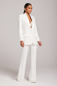 The CHARLOTTE White Pants are the perfect piece for those daring to make a statement. Made from our exclusive crepe and satin material, this simple statement pant is perfect for those having rehearsal dinners or even for the big day. Why not pair with our matching CHARLOTTE White Bra Top, CHARLOTTE White Blazer, FAYE White Top, ZOE White Waistcoat, or NICOLA White Blazer, to complete the look. - Made from our exclusive crepe and satin - Seam detailing to the front of the pant - Contrast satin waistband and pocket detailing to back - Main: 94% Polyester 6% Elastane Lining/Trim: 97% Polyester 3% Elastane Size & Fit Information - Item runs to our size chart. Please refer here for the best fit. - Model is 176cm/5'8" wearing 4" heels and is wearing a size XS - We recommend if you are above 5'8"" to select the size up. - I nside leg measures 90cm across all sizes - Total length is 120cm based on a size XS - Stretch Factor: No Stretch - Please note that if your style arrives longer than you desire it can be easily taken up by a local tailor