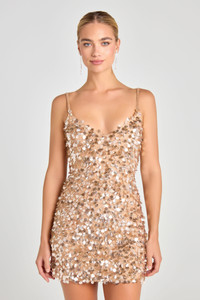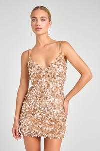 Slip into something special with the CLEO champagne dress. Crafted from diamond champagne sequins on the chiffon base, the CLEO mini dress shines with every move you make. Featuring a bodycon fit with minimal stretch, and mini hemline for playful elegance, she is the perfect companion for golden hours and cocktail parties. Complete with beaded straps, a V neckline and a concealed zip closure for a smooth fit. Note: This dress is designed with a figure-hugging silhouette to accentuate your shape. For a more relaxed fit, we recommend sizing up from your usual size. - Mini hemline - Minimal stretch chiffon fabric - Bodycon silhouette - Diamond champagne sequins - V neckline - Beaded straps - Concealed zip closure - Outer: 100% Nylon, Lining: 100% Viscose Size & Fit Information Slip into something special with the CLEO champagne dress. Crafted from diamond champagne sequins on the chiffon base, the CLEO mini dress shines with every move you make. Featuring a bodycon fit with minimal stretch, and mini hemline for playful elegance, she is the perfect companion for golden hours and cocktail parties. Complete with beaded straps, a V neckline and a concealed zip closure for a smooth fit. Note : This dress is designed with a figure-hugging silhouette to accentuate your shape. For a more relaxed fit, we recommend sizing up from your usual size. - Mini hemline - Minimal stretch chiffon fabric - Bodycon silhouette - Diamond champagne sequins - V neckline - Beaded straps - Concealed zip closure - Outer: 100% Nylon, Lining: 100% Viscose