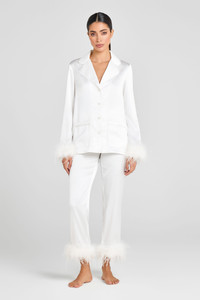 Our iconic MERABI women’s pajamas are now available in white. Meet the DARCIE white silk pajamas, perfect for the bride herself or as a gift for loved ones. These white silk touch pajamas are designed to feel as good as they look, with a smooth silk touch material and a soft feather trim at the cuffs. The white satin binding on the shirt and trouser hem cuff gives a luxurious feel, while the diamante buttons add a touch of decadence. Size & Fit Information - Item runs to our size chart . Please refer here for the best fit. - Model is 176cm/5'7" wearing 4" heels and a size S. - Elasticated waist for a smooth, comfortable fit.