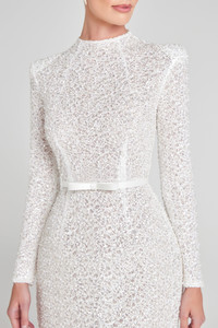EDIE is a high-neck mini dress, crafted from a sheer pearl embellished white fabric, lined in mesh. Featuring internal shoulder pads, full-length sleeves, and our signature tulip style skirt. Finished with a concealed zip closure to the centre back, and a detachable and adjustable belt featuring a white satin bow. Fully lined in mesh for a smooth fit. - Pearl embellished sheer white fabric - High neck - Internal shoulder pads - Full-length sleeves - Signature tulip style skirt - Concealed zip closure to the centre back - Fully lined for a smooth fit - Mesh lined - Tonal underwear required - Outer: 100% Polyester Size & Fit Information - Item runs to our size chart. Please refer here for the best fit. - Model is 179cm/ 5ft 9 wearing 4.5” heels and size XS - Stretch Factor: No Stretch