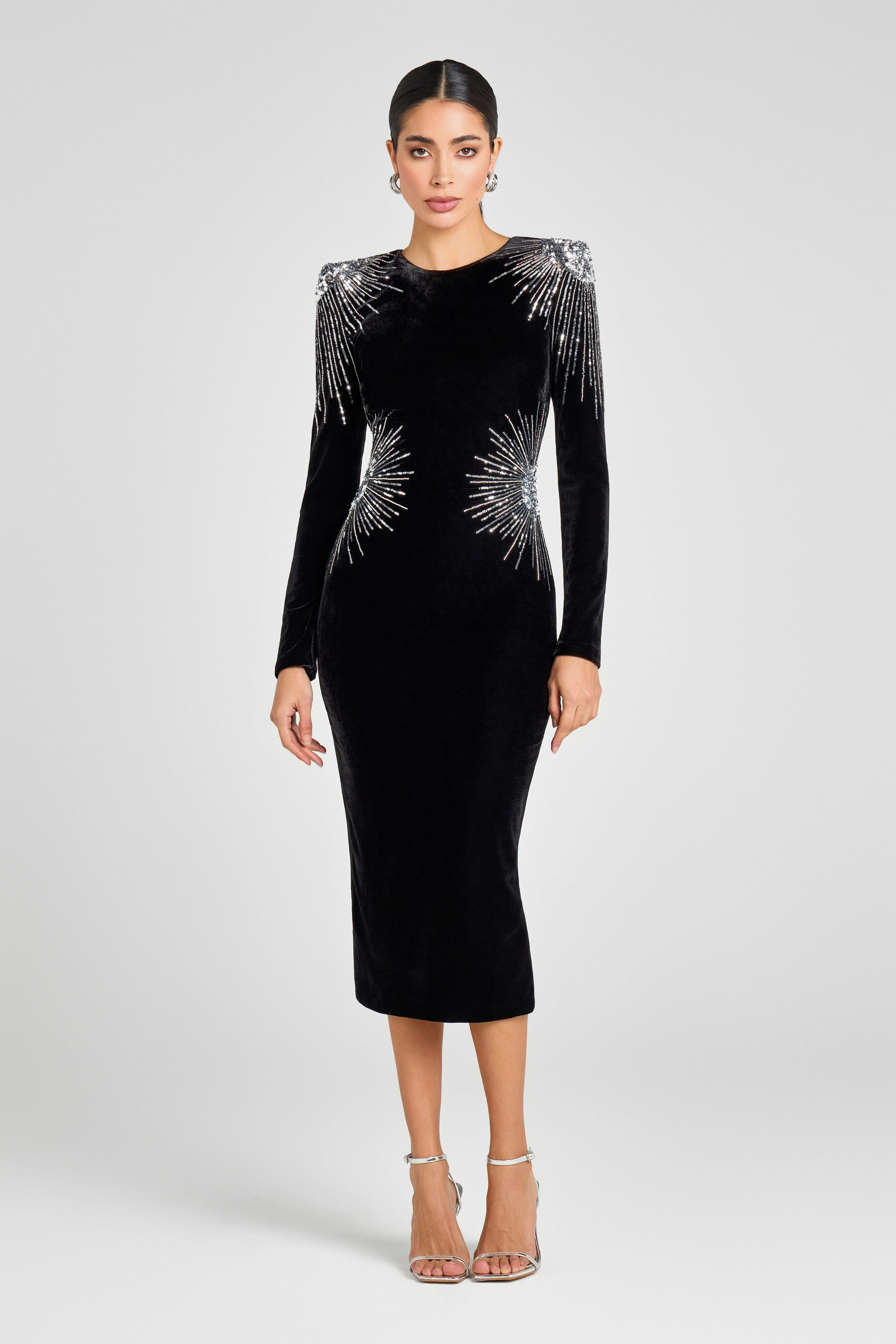 The ELLIE Black Dress is crafted from our signature velvet fabrication and cut to a bodycon midi silhouette. Structured shoulder pads frame the look, while starburst embellishment detailing adds a touch of opulence to this seasonal staple. Fully lined and finished with a concealed zip closure at the back for a smooth fit. - Signature velvet fabrication - Bodycon midi silhouette - Structured shoulder pads - Long sleeves - Crew neckline - Starburst embellishment detailing at shoulders and sides - Fully lined - Concealed zip closure at back Size & Fit Information - Item runs to our size chart. Please refer here for the best fit. - Stretch Factor: No Stretch - Model is 175cm / 5'9" wearing 4' heels and a size XS