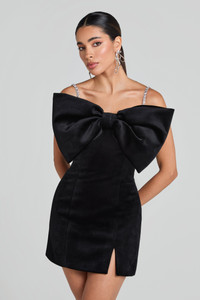 Our ELODIE Black Dress is crafted from black velvet fabric, featuring an exaggerated 3D bow, and jewel embellished detachable straps. This mini dress has internal boning to the front, back and sides, finished with a front split at the hem to contour your shape. Fully lined for a comfortable fit, the dress also includes internal silicone taping for extra support, and a concealed zip with hook-and-eye closure to the back. Pair with our HETTIE Bodysuit to complete the look. - Black velvet fabric - Bodycon fit mini - Exaggerated 3D velvet front bow - Jewel detachable straps (elasticated for adjustment) - Split to the front - Contoured seam detailing to the front and back - Boning to the front, back and sides - Silicone taping to the top edge to support the bust - Fully lined for a smooth fit - Concealed zip & hook-and-eye closure to the back - Outer Velour: 93% Polyester 7% Elastane Outer Jersey: 95% Polyester 5% Elastane Lining: 96% Polyester 4% Elastane Size & Fit Information - Item runs small to size chart and is cut to a slimmer fit around the bust. If you’re in between sizes, we recommend sizing up. - Model is 175cm/5'9" wearing 4" heels and a size S - Stretch Factor: No Stretch - Figure-hugging fit