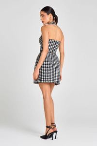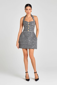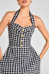 This ESME Check Dress is crafted from classic check boucle-tweed fabrication with high-shine sequin embellishment. Featuring a sweetheart corset bodice with boning through the front, back and sides for a cinched silhouette, it’s complete with our signature tulip mini shape and concealed side pockets for ease on the move. Gold-engraved, non-functional button closures detail the front, while a concealed zip fastening at the back ensures a smooth fit. - Check boucle-tweed fabrication with sequin embellishment - Sweetheart corset bodice with boning to front, back and sides - Halter neckline - Tulip mini silhouette - Concealed pockets at sides - Non-functional decorative engraved gold buttons at front - Concealed zip closure at back - Fully lined in satin - Outer: 81% Polyester 9% Cotton 6% Viscose 2% Nylon 1% Metallised Fabric 1% Acrylic, Lining: 100% Polyester Size & Fit Information - Item runs to our size chart. Please refer here for the best fit. - Model is 175cm/5'9" wearing 4" heels and a size XS - Stretch Factor: No Stretch