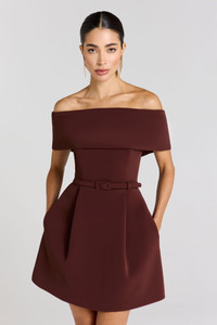 The HARPER Brown Dress is an off-the-shoulder mini, crafted from an exclusively designed brown crepe fabrication. Featuring a corset-inspired bodice with structured boning and a pleated tulip-hem skirt, this dress is designed to sculpt while offering movement. A detachable brown crepe belt cinches the waist, while functional side pockets bring ease to the structured silhouette. Finished with non-functional button detailing to the back and a concealed zip for a smooth fit. Fully lined in satin for a smooth fit. - Exclusively designed brown crepe fabrication - Straight off-the-shoulder bardot neckline - Structured corset boning to the bodice -Pleated tulip hem mini skirt - Functional side pockets - Detachable brown crepe belt - Non-functional button detailing to the back - Concealed zip closure - Fully lined in satin - Outer: 97% Polyester 3% Elastane, Skirt Middle: 95% Polyester 5% Elastane, Skirt Backing: 100% Polyester, Lining: 96% Polyester 4% Elastane Size & Fit Information - Item runs to our size chart. Please refer here for the best fit. - Model is 175cm/5'9" wearing 4" heels and a size S - Stretch Factor: No Stretch