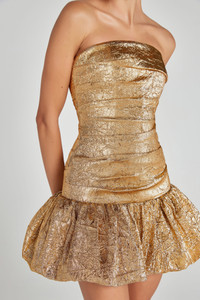 IRIS is a mini dress with a bandeau neckline, crafted from textured gold jaquard fabric. Featuring a ruched bodice with internal boning to the front, back, and sides, and a puffball style mini skirt. Finished with a concealed zip to the centre back and fully lined for a smooth fit. - Textured gold jacquard fabric - Mini dress - Bandeau neckline - Internal boning to the front back and sides - Pleated bodice - Puffball mini skirt - Concealed zip to the centre back -Fully lined for a smooth fit - Outer: 76% Polyester 24% Metallised Fibre, Lining: 64% Polyester 33% Viscose 3% Elastane Size & Fit Information - Item runs to our size chart. Please refer here for the best fit. - Model 1 is 5'8" wearing 4" heels and size XS - Stretch Factor: No Stretch