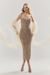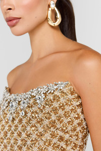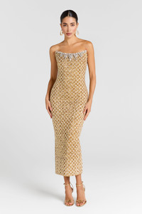 Description & Features The ISABELLA Gold Dress is crafted from a luxurious gold sequin fabrication with a beaded embellished contrast silver overlay and features a structured bodice with boning at the front, back, and sides, paired with a straight-cut midaxi skirt. It is complete with a structured curved bandeau neckline with a silver-encrusted jewel trim and finished with a concealed zip closure at the back. - Gold sequin fabrication with beaded overlay - Structured bodice with boning at the front, back, and sides - Curved bandeau neckline with a silver-encrusted jewel trim - Straight-cut midaxi skirt - Concealed zip closure at the back Size & Fit Information - Item runs to our size chart. Please refer here for the best fit. - Model is 175cm / 5'9" wearing 4" heels and a size XS - Stretch Factor: Stretch - Please note that if your style arrives at a longer length than you desire, it can be easily altered by a local tailor.