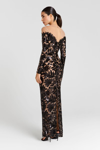 The MELISSA Black Dress is crafted from sheer nude mesh, intricately adorned with leaf sequin embellishments. Each placement is thoughtfully designed to create the perfect balance of coverage and allure. Featuring an off-the-shoulder neckline, full-length sleeves, and a sculpted maxi silhouette, this piece is finished with a concealed zip closure at the back for a smooth fit. Please note: This style is sheer with overlayed sequins and does not include a slip. To be styled with tonal underwear. - Sheer nude mesh fabrication - Off-the-shoulder neckline - Full-length sleeves - Sculpted maxi silhouette - All-over sequin leaf embellishments - Concealed zip closure at back for a smooth fit - Tonal underwear required Size & Fit Information - Item runs to our size chart. Please refer here for the best fit. - Model is 175cm / 5'9" wearing 4" heels and is wearing a size XS - Stretch Factor: No Stretch