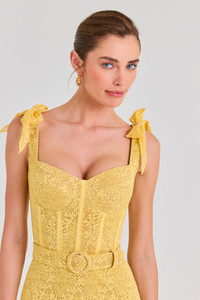 MIRANDA is a lace maxi dress, crafted from yellow lace with a nude mesh lining, featuring elegant bow-detailed straps, a sweetheart cupped neckline to the front and square to the back, an underwire bust with padding, and a structured bodice with external corset detailing. The elegant maxi features a three-tiered skirt that gathers and a detachable self-fabric buckle belt. - Yellow lace fabric - Sweetheart neckline to the front and square to the back - Bow-detailed straps - Underwire bust - Structured corset boning to the bodice - A three-tiered skirt - Detachable self-fabric buckle belt - Concealed zip closure - Outer: 98% Polyester 2% Elastane, Body Lining: 96% Polyester 4% Elastane, Skirt Lining: 100% Polyester Size & Fit Information - Item runs to our size chart. Please refer here for the best fit - Model is 175cm/5'9" wearing 4" heels and a size XS - Length; side neck point to hem 152cm, based on size XS - Stretch Factor: No Stretch
