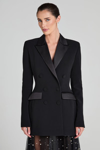 MONICA is a double-breasted blazer dress, crafted from our signature black crepe fabric. Featuring a contrast satin lapel, non-functional pockets, and buttons to the front. Fully lined in satin for a smooth fit. Designed to define your waist, this blazer dress is the ultimate silhouette enhancer. Pair with our BLAKE Black Skirt or CHARLOTTE Black Pants to complete the look. - Double breasted blazer dress - Signature black crepe fabric - Contrast satin lapel - Functional satin buttons to the front - Non-functional contrast satin pockets - Fully lined in satin for a smooth finish - Outer: 92% Polyester 8% Elastane Top Middle:93% Polyester 7% Elastane Top Backing:100% Polyester Lining: 100% Polyester Trim: 97% Polyester 3% Elastane Size & Fit Information - Item runs to our size chart. Please refer here for the best fit. - Model is 5'8" wearing 4" heels and a size XS - Stretch Factor: No Stretch