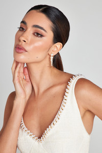 PENELOPE is a ivory midi, crafted from exclusively designed boucle-tweed style fabric with a glint of shimmer thread running through. This elegant midi offers a statement neckline, featuring pearl trim detailing, intertwined with ivory velvet fabric. The bodice features our signature cup shape and perfectly placed seam detailing to contour the body, finished with a fishtail flare style skirt, a concealed zip closure to the back and is fully lined for a smooth fit. - Ivory textured boucle-tweed fabric with a glint of shimmer - Fishtail flare design - Pearl trim chain detailing - Perfectly placed seam detailing for body contouring - White velvet detailing running through - Statement neckline - Concealed zip closure - Fully lined - Bodycon fit - Outer: 100% Polyester, Lining: 96% Polyester 4% Elastane Size & Fit Information - Item runs to our size chart. Please refer here for the best fit. - Model is 175cm/5'9" wearing 4" heels and a size XS - Stretch Factor: Stretch - Figure-hugging fit