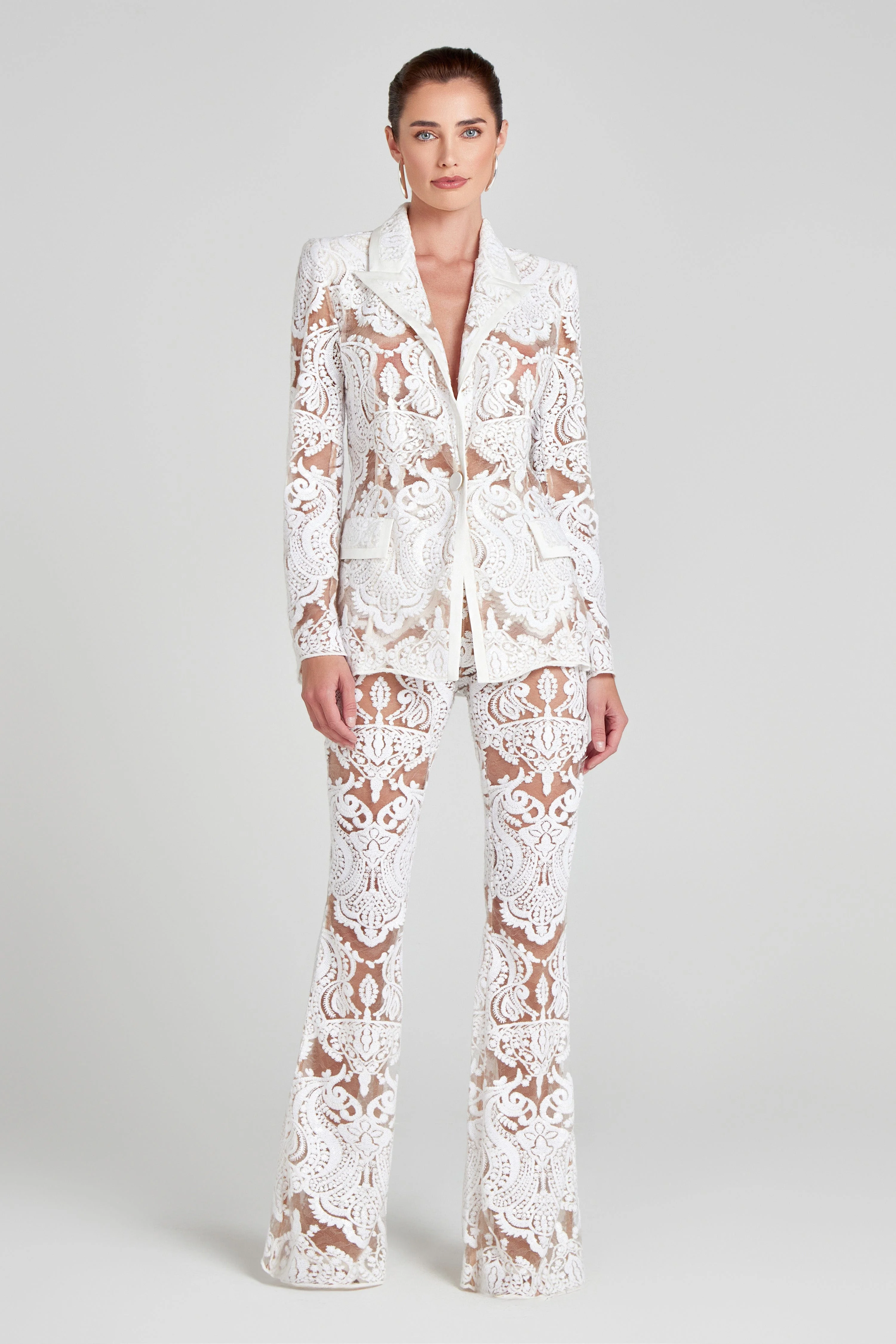 Flaunt confidence in PIPER. A bold design perfect to be worn when toasting to new beginnings. The white sequin embroidered lace mesh trouser features a statement oriental pattern that cascades down the piece, shimmering in each spectacle of light. Featuring a sheer nude mesh lining that breaks the pattern, creating a glamorous effect. Designed with a high waist, a mesh-faced waistband for comfort, and a scalloped hem along the bottom of the trouser. Finished with a mesh bound zipper and seams for comfort, and a flare from the knee down. Why not pair with our matching PIPER White Blazer ? - Sequin embroidered lace mesh - Statement oriental pattern - High waist - Mesh-faced waistband for comfort - Scalloped hem along the bottom of the trouser - Mesh-bound zipper and seams - Flare from the knee down - Sheer nude mesh lining - Tonal nude underwear recommended Size & Fit Information - Item runs to our size chart. Please refer here for the best fit. - Model is 177cm/5'9" wearing 4" heels and a size XS - Inseam length 87cm based on a size XS - Slim fit - Stretch Factor: No Stretch - Please note that if your style arrives longer than you desired it can be easily taken up by a local tailor.
