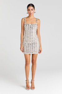 The TATE Silver Dress is crafted from a decadent fully beaded fabric with jewel detailing. This mini dress features a square neckline at the front and a V-neckline at the back, a flattering bodycon silhouette, and thick straps for support. Lined in satin and finished with a concealed back zip, it ensures a smooth, comfortable fit. - Decadent fully beaded fabrication with jewel detailing - Bodycon mini silhouette - Square neckline at front - V-neckline at back - Thick straps - Concealed back zip closure Size & Fit Information - Item runs to our size chart. Please refer here for the best fit. - Model is 5'9" wearing 4" heels and a size XS - Stretch Factor: No Stretch