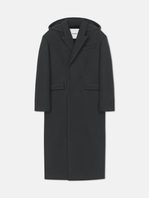 The Melva Coat by Nanushka is a new, refined layering piece in rich-toned felted wool. Its double-breasted front and detachable hood blend utilitarian detail with fluid tailoring. Fit Intentionally designed for an oversized look. Model is 180 cm (5'11'') and wears a size S. Materials and Care Shell 1: 75% VIRGIN WOOL 25% POLYAMIDE Shell 2: 67% TRIACETATE 33% POLYESTER Lining: 100% FSC VISCOSE Detail: COATING: POLYURETHANE BASE: 100% POLYESTER (RECYCLED) Do not wash, Do not bleach, Do not tumble dry, Iron low heat (110°), Gentle Dry clean any solvent except Trichloroethylene