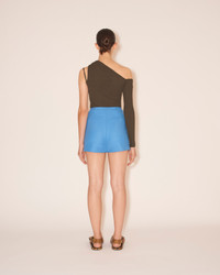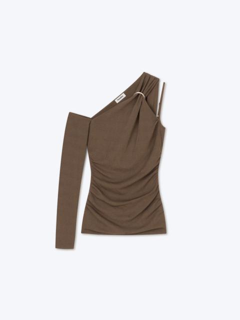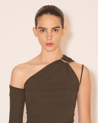 The one-shoulder silhouette is remade with the addition of an asymmetric neckline. The Aleza top features one sleeve, sliced to show off the clavicle, while the opposite side is detailed with a double strap - one skinny, one wide and structured with a metal ring. In dark moss mesh jersey, gentle ruching defines the waist. Body: 100% Recycled Polyester