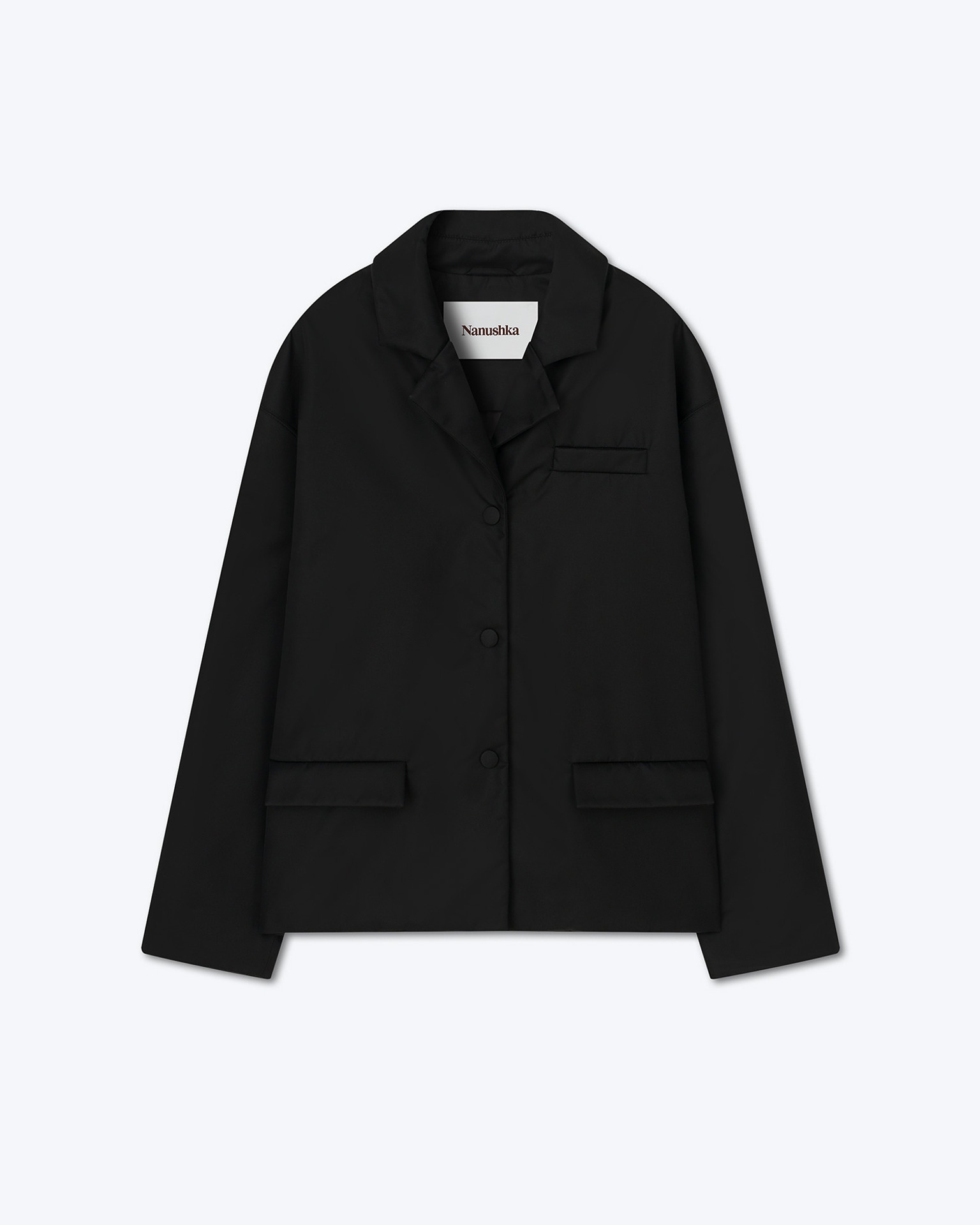 Exemplifying our focus on sustainable design, the black Almeda jacket is made from nylon upcycled from past Nanushka collections. It’s cut to a boxy silhouette with slim notch lapels and snap closure at the front. Shell: POLYAMIDE ECONYL WITH ACRYLIC RESIN 100%