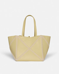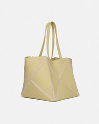 Origami tote folds completely flat to offer a functional solution for storing all your essentials, along with easy-to-carry shoulder straps. It is crafted from soft patent alt-nappa and detailed with contrast merrow stitching to create a patchwork effect. Materials and Care Shell1: Coating: Polyurethane, Base: 100% Polyester, Shell2: 100% Cotton, Lining: 50% Polyamide 50% Polyurethane, Hardware: 100% Zamak Due to the delicate nature of this product, please avoid strong solvents when cleaning and abrasive surfaces as this will cause damage. do not wash. do not bleach. do not tumble dry. do not iron. do not dry clean. handle with care to ensure bag lifespan. repair or resell to support circular fashion.