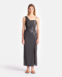 Asymmetric, draped silhouettes are one of our key design elements. Made from our exclusive Okobor™ alt-leather, the Fenera dress is artfully draped through the waist. It falls to mid-calf length with a side slit. Fit Standard fit, matches usual sizing. Model is 177 cm (5'9'') and wears a size S. Materials and Care Shell: Coating: Polyurethane Base: 100% Polyester Do not wash, do not bleach, do not tumble dry, do not iron, gentle dry clean any solvent except trichloroethylene this product is made from a delicate fabric and has a special finish, the dark colour of this product may transfer onto light surfaces and cause damage, please store separately and handle with care. handle with care to ensure garment lifespan. repair or resell to support circular fashion. handle with care to ensure garment lifespan. repair or resell to support circular fashion.