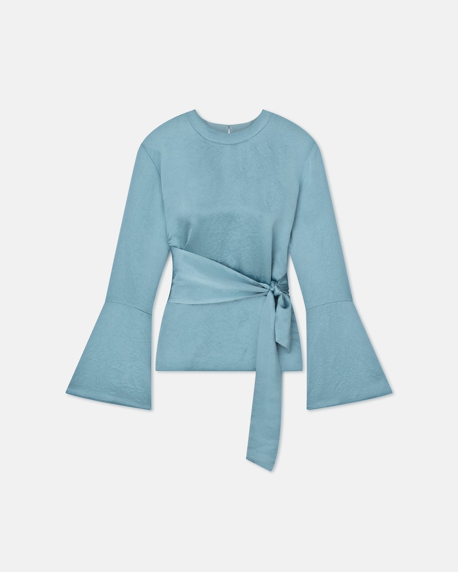 Colour and texture combine in the Ilone top. It is made from lustrous crinkled satin that heightens the intensity of the aqua tone. It has effortlessly elegant fluted sleeves and can be cinched at the waist with the tie-fastening belt. Fit Regular fit, true to size. Crew neck top with fluted sleeves Belt detailing Button loop closure on the back Crinkled satin material gives a slight textured look to the garment Materials and Care Shell: 100% Acetate. Naia™ is a cellulosic fiber made from sustainably sourced wood pulp. It’s produced in a safe, closed-loop process where solvents are recycled back into the system for reuse. Machine wash warm (30°), do not bleach, do not tumble dry, iron low heat (110°), gentle dry clean any solvent except trichloroethylene . handle with care and wash less to ensure garment lifespan. repair or resell to support circular fashion.