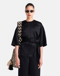 We’re drawn to crushed and wrinkled textures this season. The Besia top is made from crinkled satin in timeless black and can be cinched at the waist with the accompanying belt. Fit Standard fit, matches usual sizing. Model is 177 cm (5'9'') and wears a size S. Materials and Care Shell: 100% Acetate Machine wash warm (30°), do not bleach, do not tumble dry, do not iron, gentle dry clean any solvent except trichloroethylene handle with care and wash less to ensure garment lifespan. repair or resell to support circular fashion.naia™ is a cellulosic fiber made from sustainably sourced wood pulp. it’s produced in a safe, closed-loop process where solvents are recycled back into the system for reuse.
