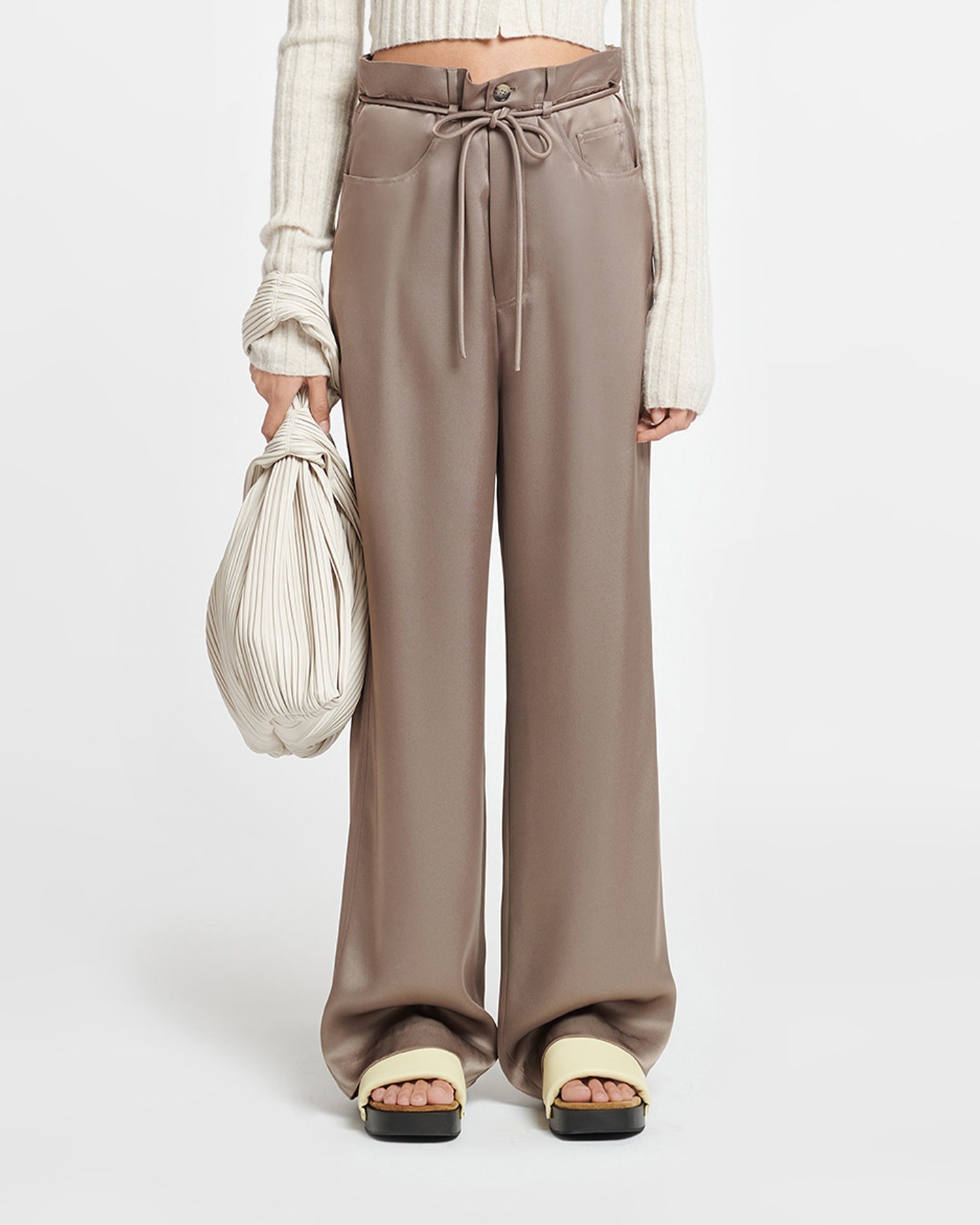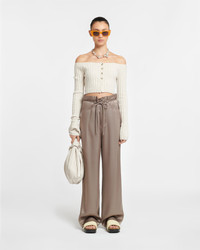 We intentionally embrace distorted perceptions of fit in our design philosophy. The Sato pants are made from fluid slip satin with a paper-bag waist brought together by a tubular self-tie belt. They fall in loose legs and come in a versatile clay tone. Fit Designed to be intentionally oversized. Take your usual size for the oversized effect, or take a size down for a more regular fit. Model is 175 cm (5'9") and wears size S. Materials and Care Shell: 81% Acetate 19% Polyester Lining: 53% Viscose 47% Polyester Do not wash, Do not bleach, Do not tumble dry, Iron low heat (110°), Dry clean any solvent except Trichloroethylene