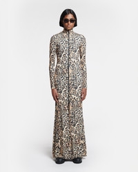 The Blaize dress is crafted from our signature mesh jersey for a figure-sculpting fit accentuated by a sports-inspired zip fastening through the front. The streamlined silhouette is offset by the floor-pooling skirt, and the bold leopard print is undeniably '90s. Fit Close to the body: Designed to fit sleekly against the body. Turtleneck zip up dress Zipper closing in the front Soft ruffles on the bottom Close to the body Model is 180 cm (5'11'') and wears a size S. Materials and Care Shell: 100% Polyester (Recycled) Machine wash warm (30°), do not bleach, do not tumble dry, iron low heat (110°), dry clean any solvent except trichloroethylene. handle with care and wash less to ensure garment lifespan. repair or resell to support circular fashion.