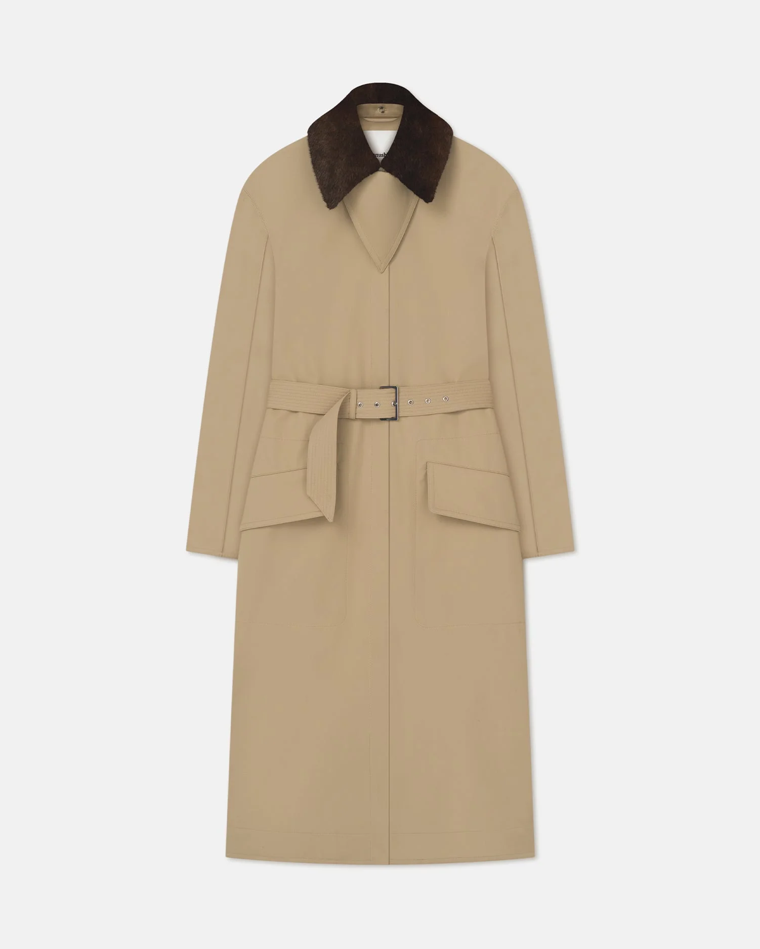 The Talbot Coat by Nanushka is an elevated reimagining of the classic trench coat. Blending the classic trench shilouette with a rich faux fur collar, this coat is a staple piece for the season. Fit Standard fit, matches usual sizing Model is 180 cm (5'11'') and wears a size S. Materials and Care Shell: 100% COTTON Base: 83% POLYAMIDE 17% ELASTANE Lining: 70% COTTON 30% POLYAMIDE Detail: FUR: 100% ACETATE Do not wash, Do not bleach, Do not tumble dry, Iron low heat (110°), Do not dry clean