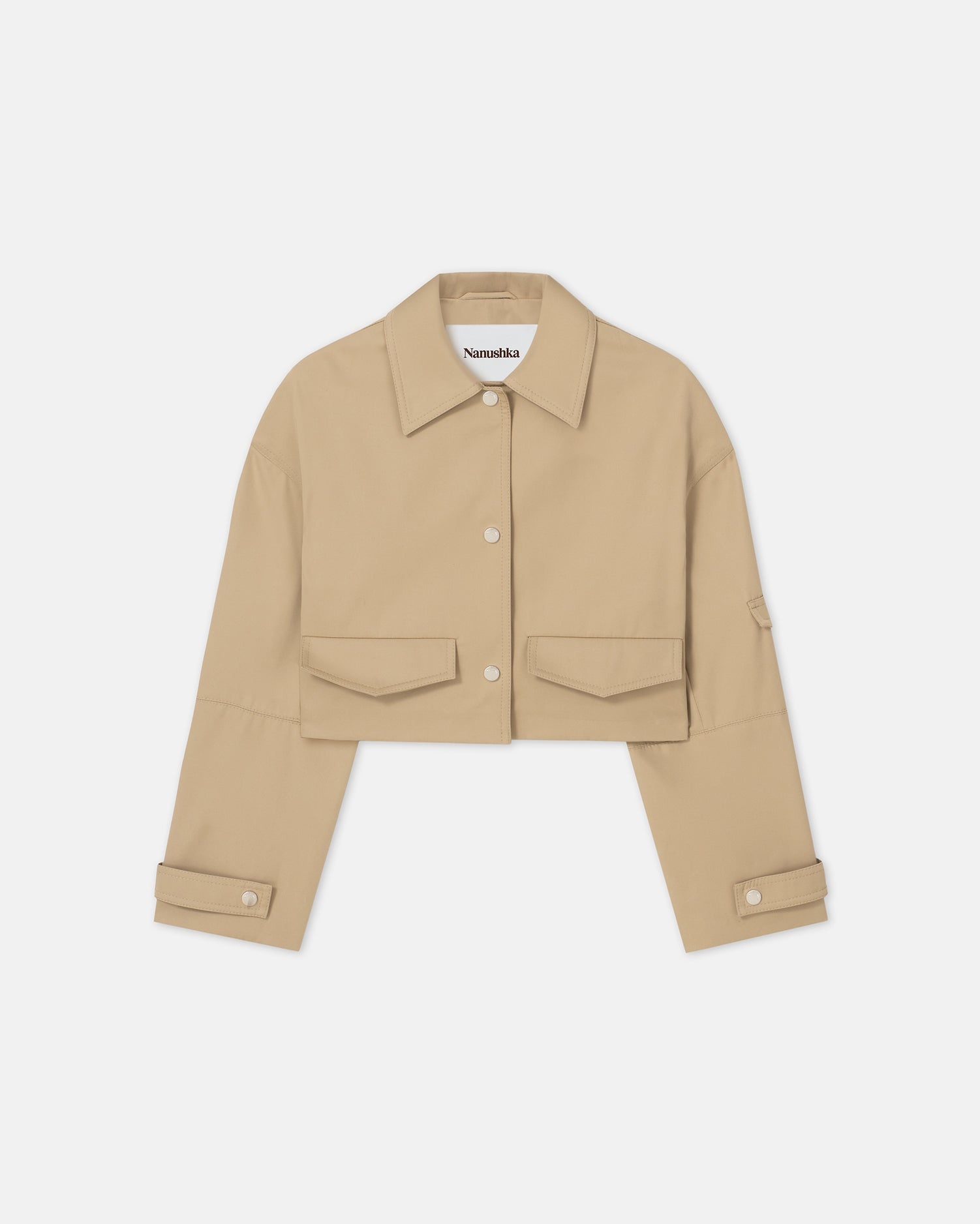 The Bracha jacket is inspired by the classic trench coat from the bonded construction and beige tone to the snap-fastening cuffs and flap pockets. It has a boxy silhouette that is cropped to the hips. Materials and Care Shell: 100% Cotton Lining: 83% Polyamide 17% Elastane Do not wash, Do not bleach, Do not tumble dry, Do not iron, Can be dry cleaned but only using hydrocarbons and trifluorotrichloromethane