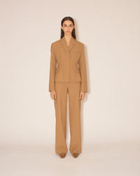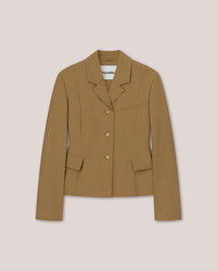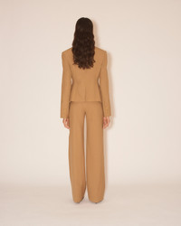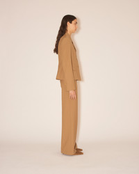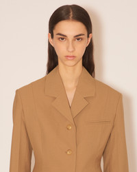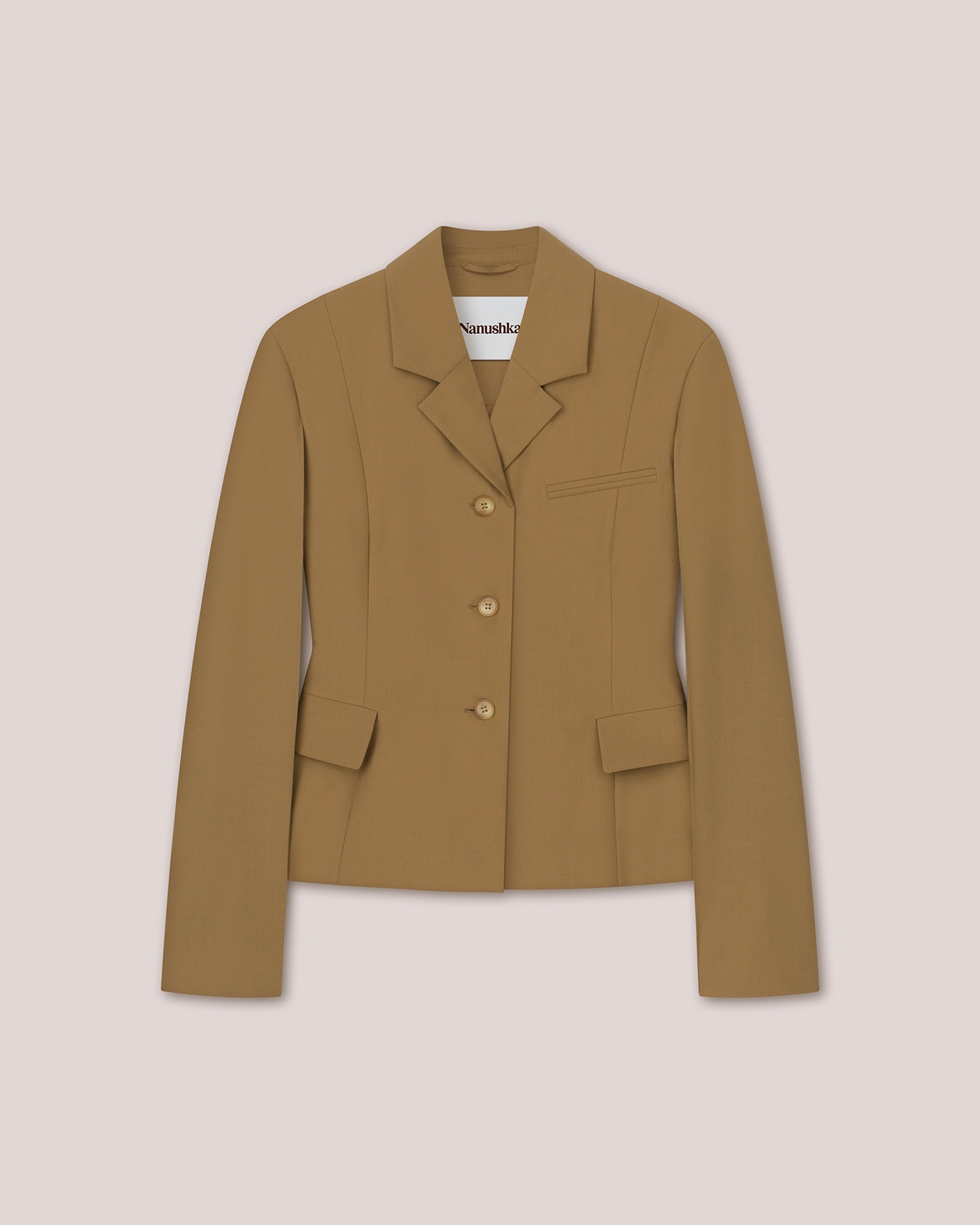 Crafted from lightweight summer suiting fabric, the camel Bora jacket is subtly sculpted at the waist for a softly defined tailored effect. With a sharp notch lapel, dual flap pockets and neat three button closure, this blazer combines effortless elegance with considered functionality. Body: 53% POLYESTER RECYCLED PRE-CONSUMER 44% VIRGIN WOOL 3% ELASTANE Lining: 100% VISCOSE