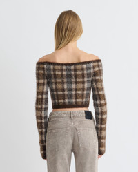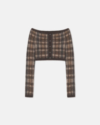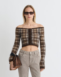 Nanushka’s Liliah Cardigan redefines classic knitwear by adding a touch of modern sensuality. Spun from brushed alpaca wool, this cropped off-the-shoulder cardigan embraces the body with warmth and softness. The brown and creme check pattern adds an earthy sophistication which echoes the Fall-Winter collection’s vision of empowered, versatile femininity. Fit Tailored to be fitting against the body. Model is 175 cm (5'9") and wears a size S. Materials and Care Shell: 47% POLYAMIDE, 30% WOOL, 20% ALPACA, 3% ELASTANE Hand wash, Do not bleach, Do not tumble dry, Iron low heat (110°), Dry clean any solvent except trichloroethylene, Dry flat