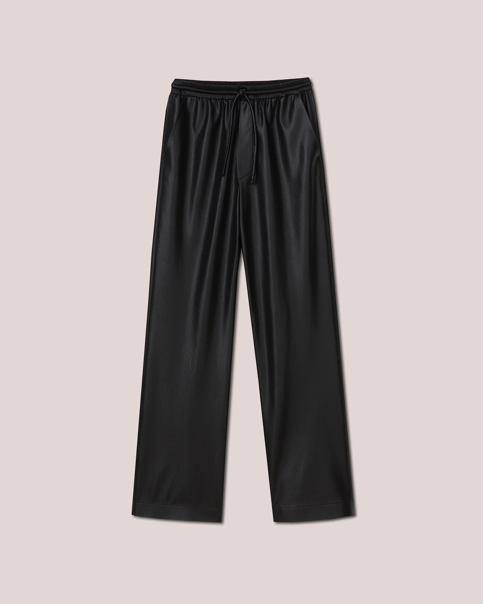 Showcasing Nanushka’s signature OKOBOR™ alt-leather in classic black, the Calie pants can easily be dressed up or down. The relaxed drawstring waist can be worn low on the hips or high on the waist, while slip pockets and a straight leg silhouette provide practical ease. OKOBOR™ is exclusive to Nanushka. Our new alternative to leather, with 100% recycled backing and a more responsible composition. Previously referred to as vegan leather, alt-leather is free from the use of animal skin or derivatives. Body 56% RECYCLED POLYESTER Body 44% POLYURETHANE Lining 56% ACETATE Lining 44% VISCOSE