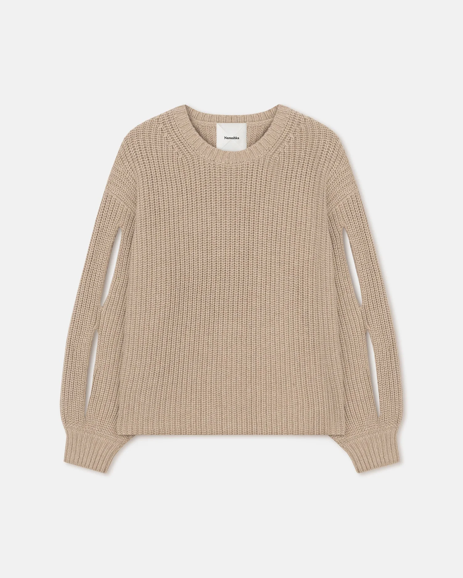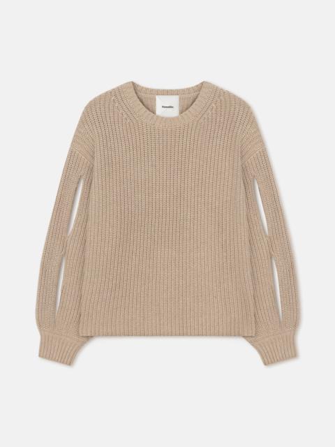 The Jacint sweater is a timeless piece with a modern edge. It is knitted from a super-soft blend containing cashmere and has cut outs at the sleeves. The dropped shoulder seams and ribbed finish accentuate the enveloping, cosy feel. Fit Standard fit, matches usual sizing. Model is 177 cm (5'9'') and wears a size S. Materials and Care Shell: 90% Rws Wool 10% Cashmere Hand wash, do not bleach, do not tumble dry, iron low heat (110°), gentle dry clean any solvent except trichloroethylene, do not wring. Handle with care and wash less to ensure garment lifespan. Repair or resell to support circular fashion.