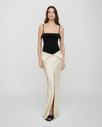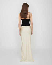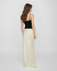 The Mentari Skirt redefines fluid tailoring. Crafted from crisp satin, this maxi skirt design features a folded-back waistline and a built-in waistwarmer for sculptural depth. It comes in ecru color. Fit Standard fit, matches usual sizing Model is 178 cm (5'10") and wears a size S. Materials and Care Shell: 82% TRIACETATE 18% POLYESTER Machine wash warm (30°) Do not bleach Do not tumble dry Iron low heat (110°) Dry clean any solvent except trichloroethylene