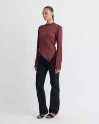The Endah Top redefines a wardrobe essential with its sculptural precision. Cut from fluid yet structured crisp satin, its regular fit is elevated by an asymmetric hem that introduces subtle movement and edge. In a rich mahogany, this long-sleeved crew-neck design merges effortless elegance with a contemporary silhouette. Fit Standard fit, matches usual sizing Model is 175 cm (5'9'') and wears a size S. Materials and Care Shell: 82% TRIACETATE 18% POLYESTER Machine wash warm (30°) Do not bleach Do not tumble dry Iron low heat (110°) Dry clean any solvent except trichloroethylene