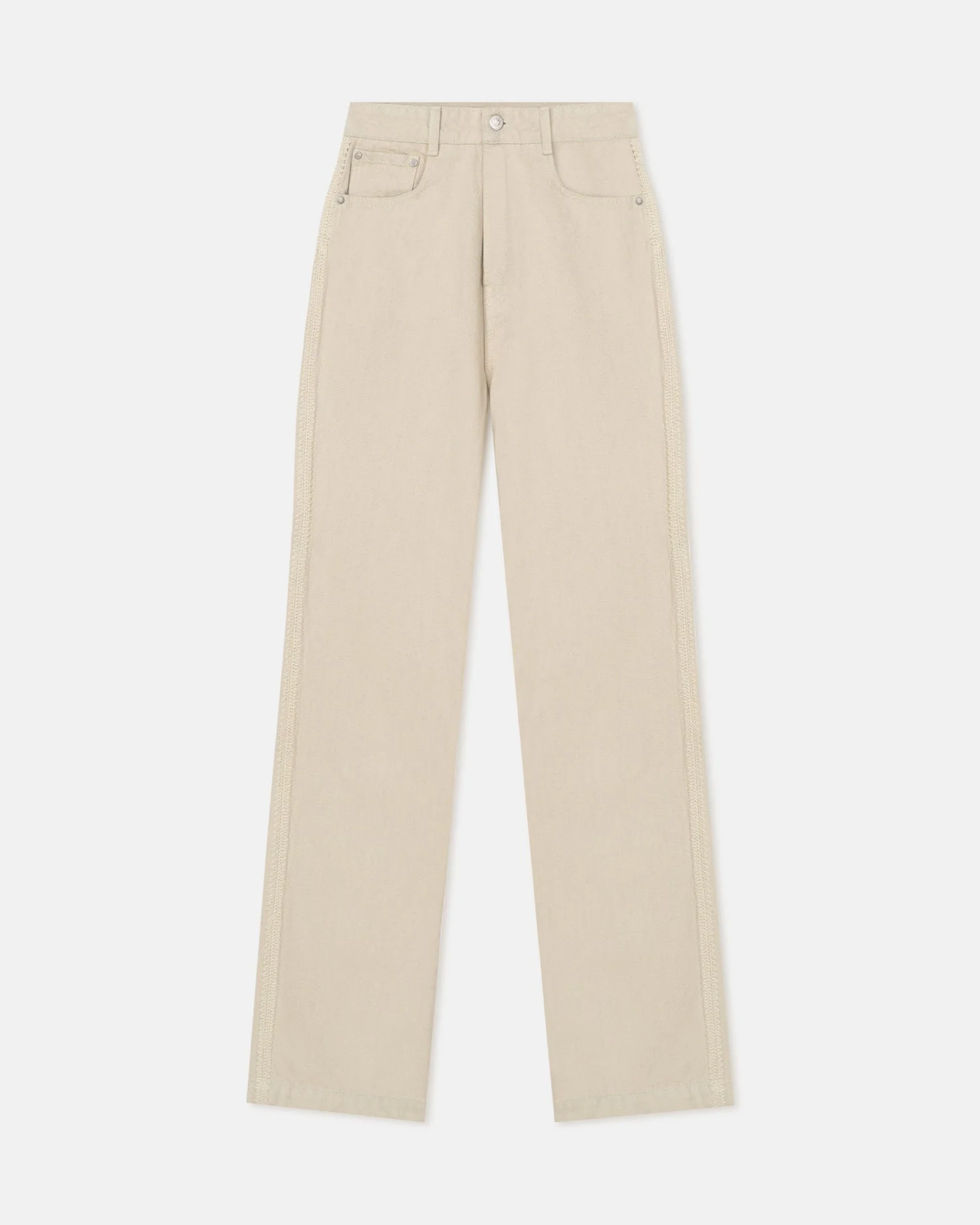 Inspired by utilitarian aesthetics, the Seldes jeans are made from beige denim. They have a high-waist and elongated straight-leg fit outlined by crochet trims. Wear yours with the matching overshirt. Fit Standard fit, matches usual sizing. Materials and Care Shell: 100% Cotton Lining: 100% Cotton Hand wash, do not bleach, do not tumble dry, iron low heat (110°), gentle dry clean any solvent except trichloroethylene Handle with care and wash less to ensure garment lifespan. Repair or resell to support circular fashion.