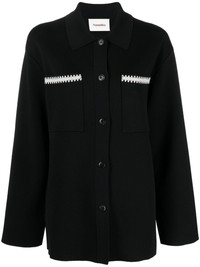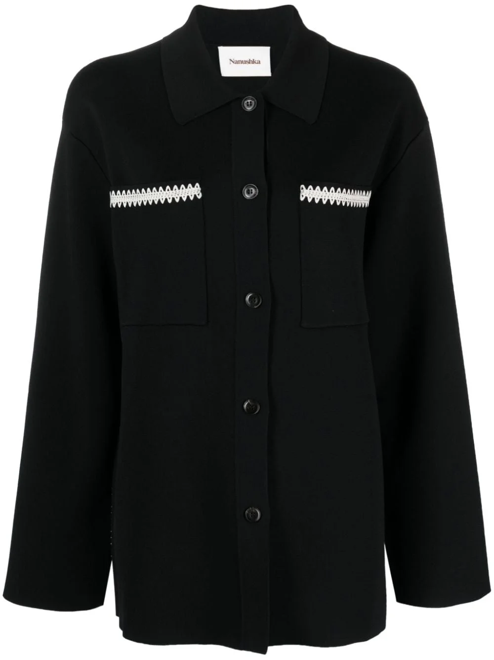 Silvia crochet-trim shirt Nanushka spotlights its affinity for traditional craft with this Silvia shirt, thanks to the contrasting crochet trims that decorate the chest. It’s cut to a boxy silhouette and framed with a classic collar. Highlights - Black/cream white - Recycled viscose blend - Crochet trim - Classic collar - Two chest patch pockets - Front button fastening - Long sleeves - Straight hem Imported Composition Recycled Viscose 52%, Recycled Polyamide 46%, Recycled Elastane 2% SIZE & FIT Model measurements Height 5 ft 10 in(1.78 m) Bust/Chest 32.67 in(83 cm) Hips 35.43 in(90 cm) Waist 23.22 in(59 cm) Measurement SLEEVE LENGTH 18.89 in(48 cm) LENGTH 29.13 in(74 cm) WAIST 43.3 in(110 cm) BUST 43.3 in(110 cm) Shoulder Width 19.68 in(50 cm) FittingInformation Designed for an oversized fit, offering additional room throughout Made with a midweight knit, this piece offers some stretch This piece fits true to size – take your usual size Washing instructions Hand Wash