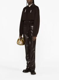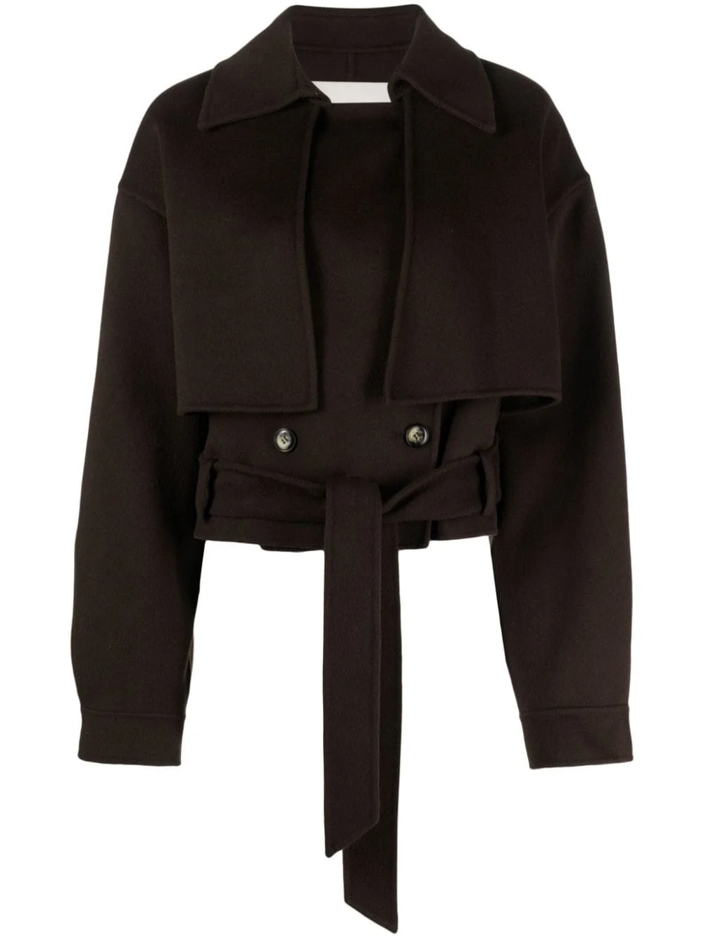 cropped trench jacket Nanushka presents a contemporary take on the classic trench silhouette for AW23 with this brown jacket, made from a blend of wool and silk and cut to a cropped length. Highlights - Coffee brown - Wool-silk blend - Layered design - Spread collar - Double-breasted button fastening - Cropped - Belted waist - Long sleeves Imported Composition Outer: Wool 90%, Silk 10% Lining: Polyamide 100% SIZE & FIT Model measurements Height 5 ft 10 in(1.79 m) Bust/Chest 31.1 in(79 cm) Hips 35.03 in(89 cm) Waist 24.01 in(61 cm) FittingInformation Designed for a boxy fit, intended for a loose fit throughout The tie fastening gives an adaptable and personalised fit Made from a midweight non-stretch fabric This piece fits true to size – take your usual size Washing instructions Dry Clean Only