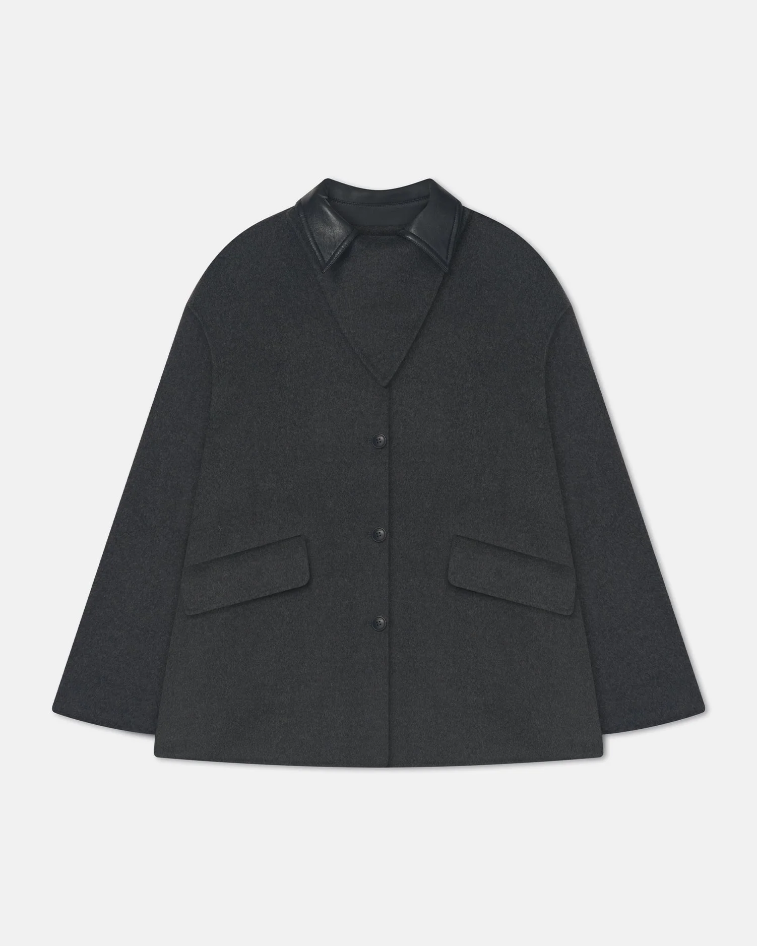 Our Jada Jacket juxtaposes sharp tailoring with an oversized fit. In grey melange double wool with a black regenerated leather collar. Fit Intentionally designed for an oversized look. Model is 180 cm (5'11'') and wears a size S. Materials and Care Shell 1: 90% WOOL 10% SILK Shell 2: BASE: 100% POLYESTER COATING: POLYURETHANE BACK:BONDED LEATHER Middle: 80% POLYESTER20% POLYAMIDE Lining: 100% VISCOSE Do not wash Do not bleach Do not tumble dry Do not iron Gentle Dry clean any solvent except Trichloroethylene