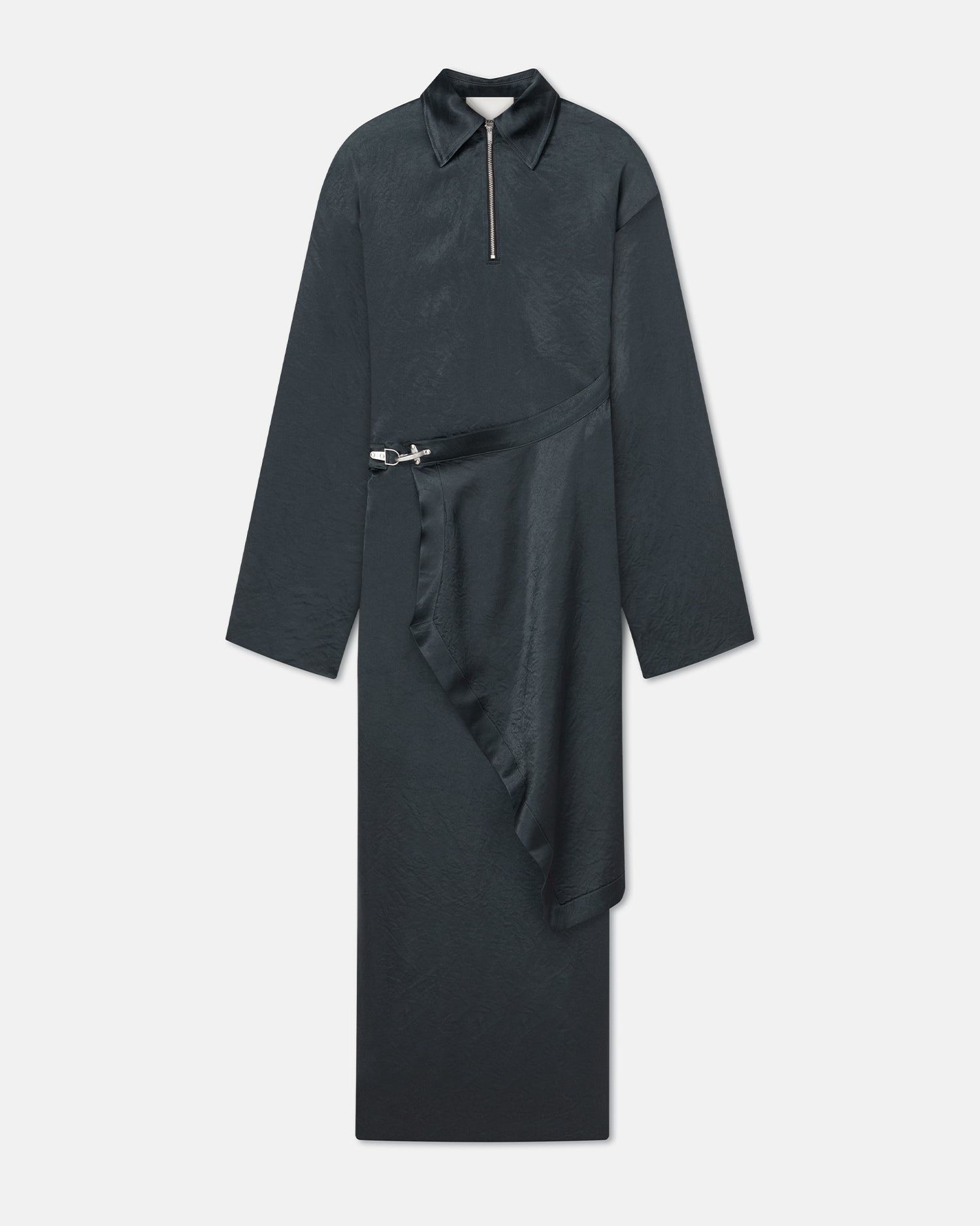 The Colter crinkled satin midi dress is draped in a way that feels equally fresh and elegant. It also has a zip-fastening neckline and buckle at the waist – biker-inspired details that emphasis the modern feel. Fit Standard fit, matches usual sizing. Model is 177 cm (5'9'') and wears a size S. Materials and Care Shell: 100% Acetate Machine wash warm (30°), do not bleach, do not tumble dry, do not iron, dry clean any solvent except trichloroethylene. Handle with care and wash less to ensure garment lifespan. Repair or resell to support circular fashion.