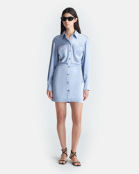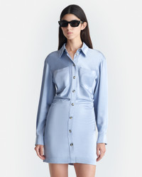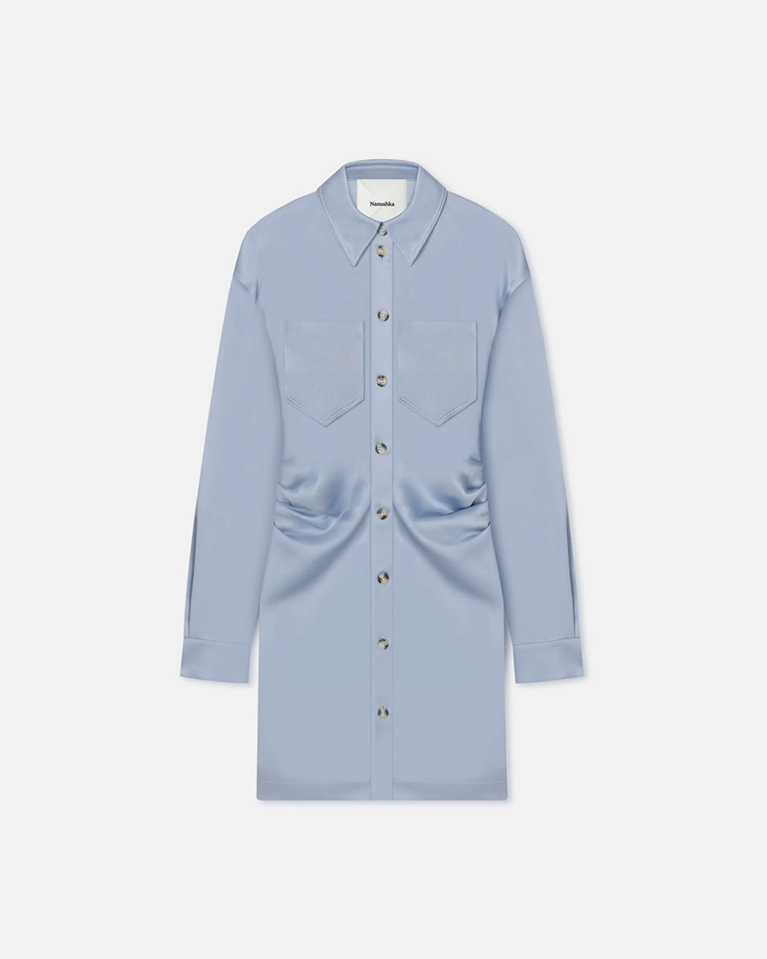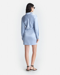 The Arona dress is modelled on classic shirt styles, but is unmistakable Nanushka thanks to its draped silhouette. It’s made from our liquid-like slip satin in a lustrous blue tone. Fit Standard fit, matches usual sizing. Materials and Care Shell: 86% Triacetate 14% Polyester Machine wash warm (30°), do not bleach, do not tumble dry, iron low heat (110°), dry clean any solvent except trichloroethylene. Handle with care and wash less to ensure garment lifespan. Repair or resell to support circular fashion.