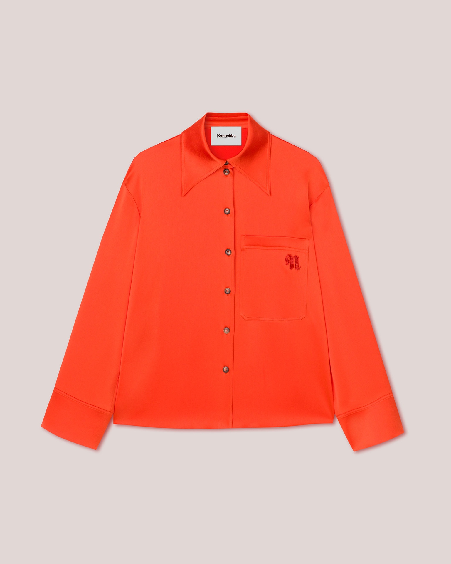 A fluid blood orange slip satin brings louche energy to the Ebba shirt. An exaggerated point collar, relaxed fit and monogrammed patch pocket finish the laid-back vibe. Body: 78% TRIACETATE 22% POLYESTER