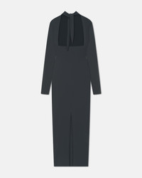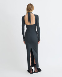 Nanushka’s Glinda Dress blends fluidity with precision. Crafted from elastic jersey, this close-fitting turtleneck midi dress has an open back, tied with delicate straps. In dusty blue, it balancing structure, movement, and quiet sensuality for a striking, seasonless silhouette. Fit Tailored to be fitting against the body. Model is 175 cm (5'9") and wears a size S. Materials and Care Shell: 62% POLYAMIDE 38% ELASTANE Machine wash warm (40°) permanent press, Do not bleach, Do not tumble dry, Iron low heat (110°), Dry clean any solvent except trichloroethylene