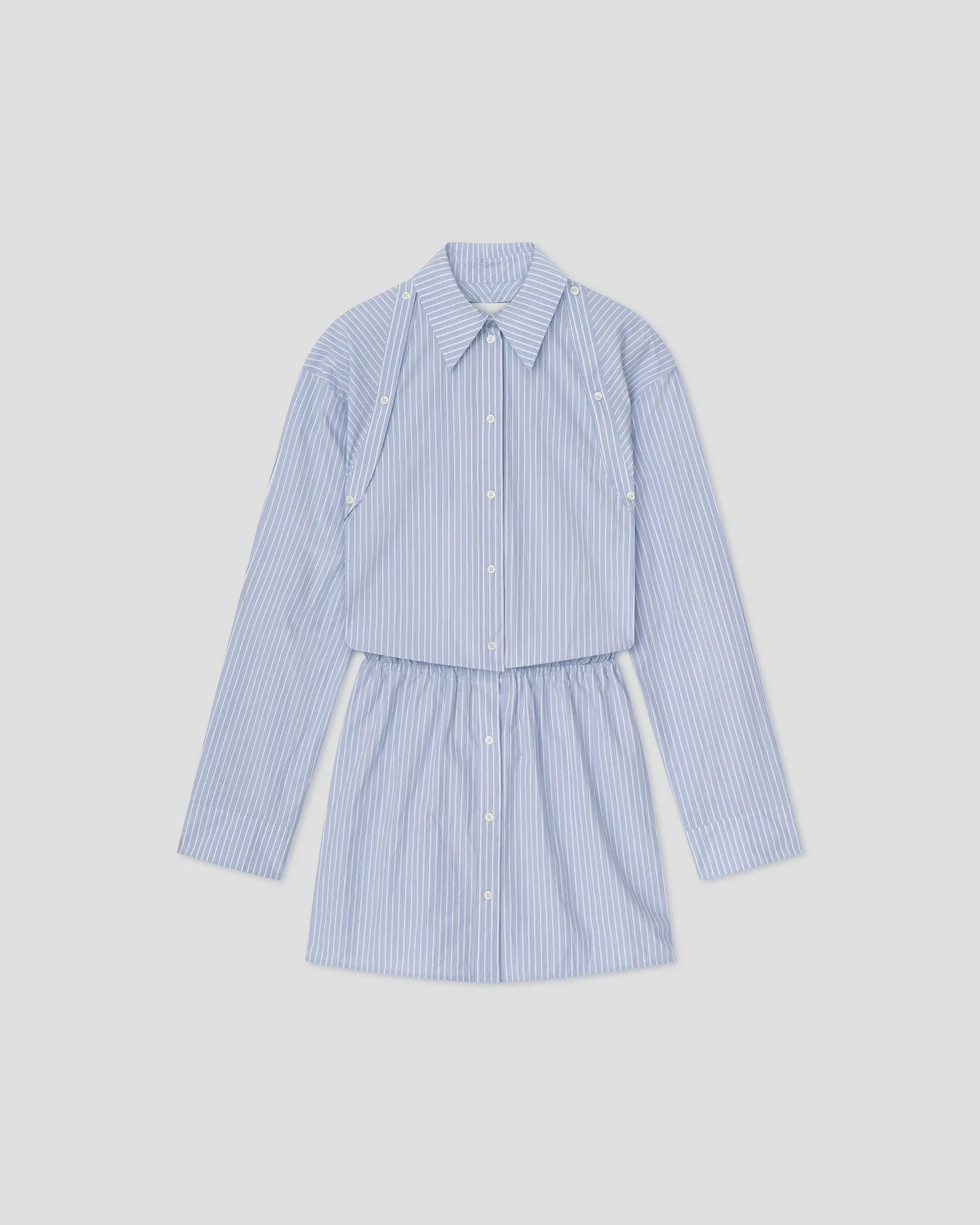The Odran dress reworks classic stripe shirting with a relaxed, more directional feel. Its regular-fit silhouette is shaped by an elasticated waist, while the buttoned off-shoulder detail introduces structure and subtle tension through the upper body. In blue, white and navy, it feels crisp, easy and distinctly modern. Fit Standard fit, matches usual sizing. Materials and Care Shell: 100% COTTON Button: REAL SHELL Machine wash warm (30°) permanent press, Do not bleach, Do not tumble dry, Iron low heat (110°), Gentle Dry clean any solvent except Trichloroethylene