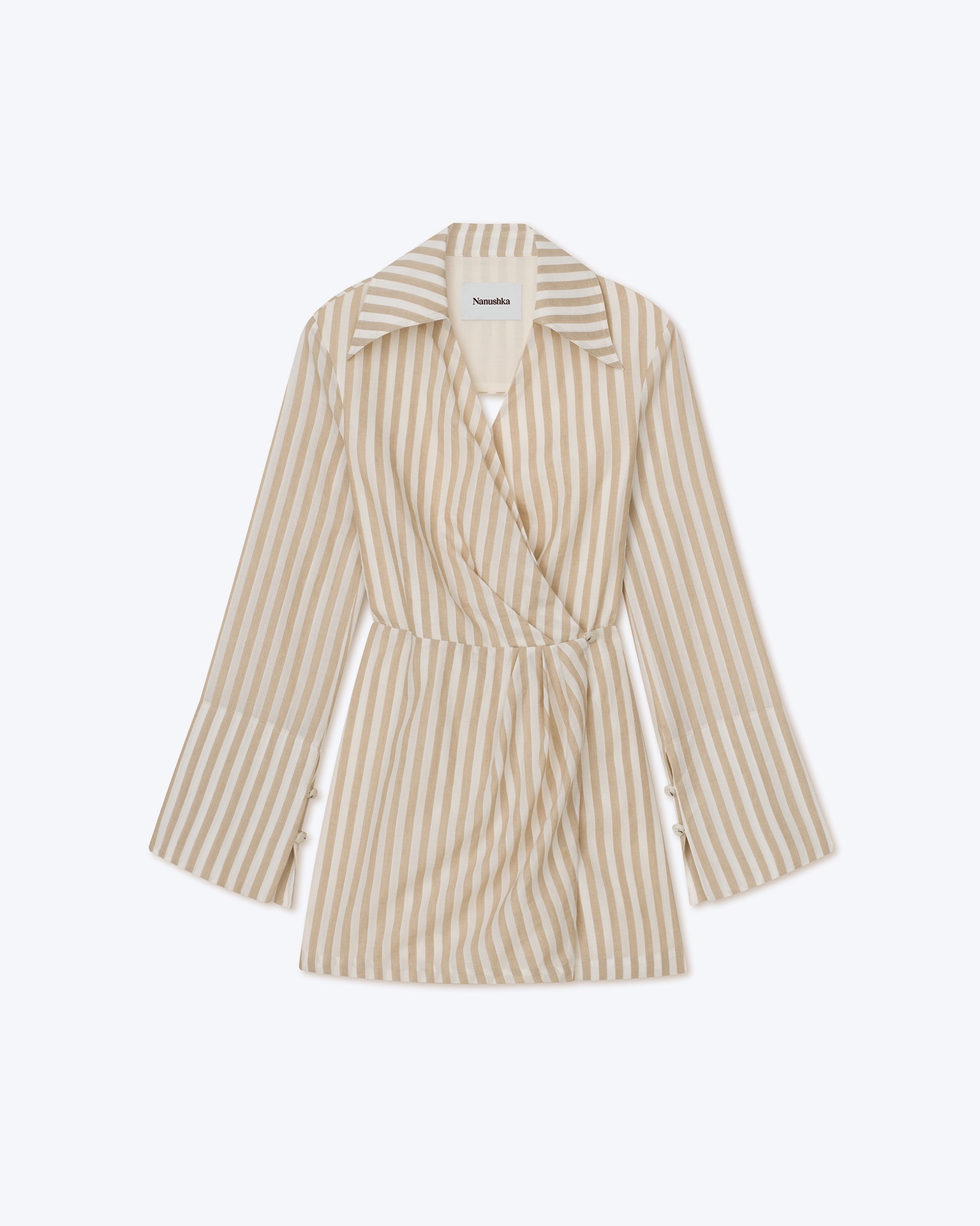 Hot summer days call for Esma’s easy refinement. Drawing from this season’s key wrap shape, this mini dress features a draped waist, wide open collar and relaxed long sleeves. Our upcycled striped linen shirting fabric enhances the fresh feel. Body: 72% COTTON 28% LINEN