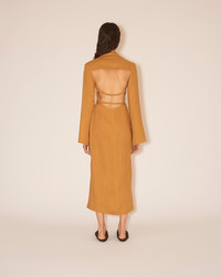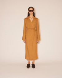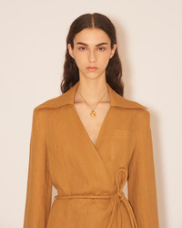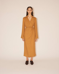 A wrap dress with a difference, the Farah is precisely cut for effortless wear. A cut-out back, wide open collar and easy split button cuff sleeves feature on this breezy midi style cut from camel linen, while a tubular tonal belt ties the look together. Body: 100% LINEN Detail: 100% LINEN